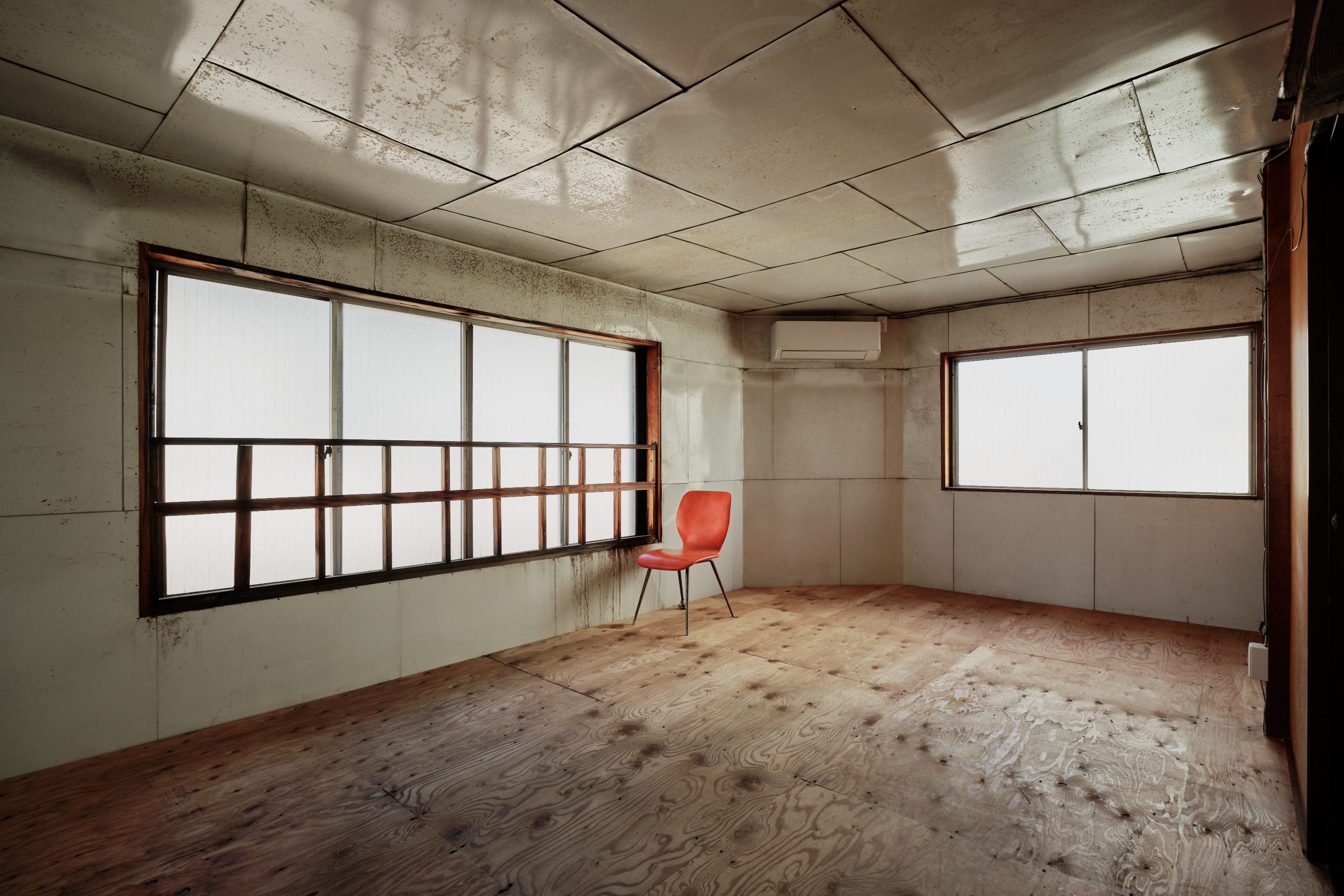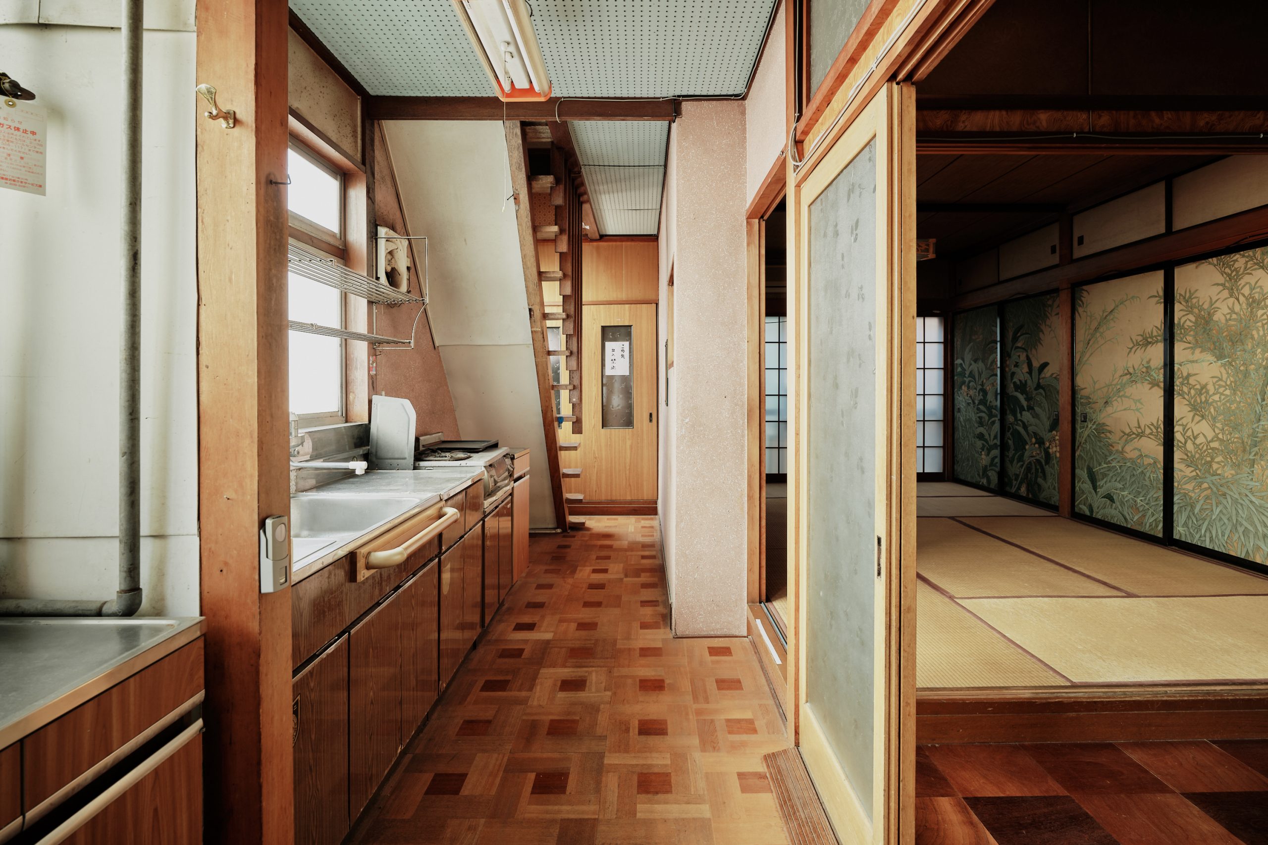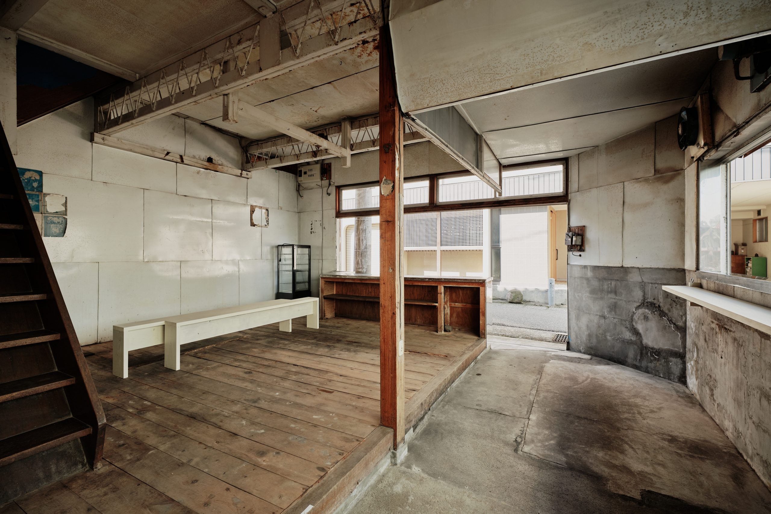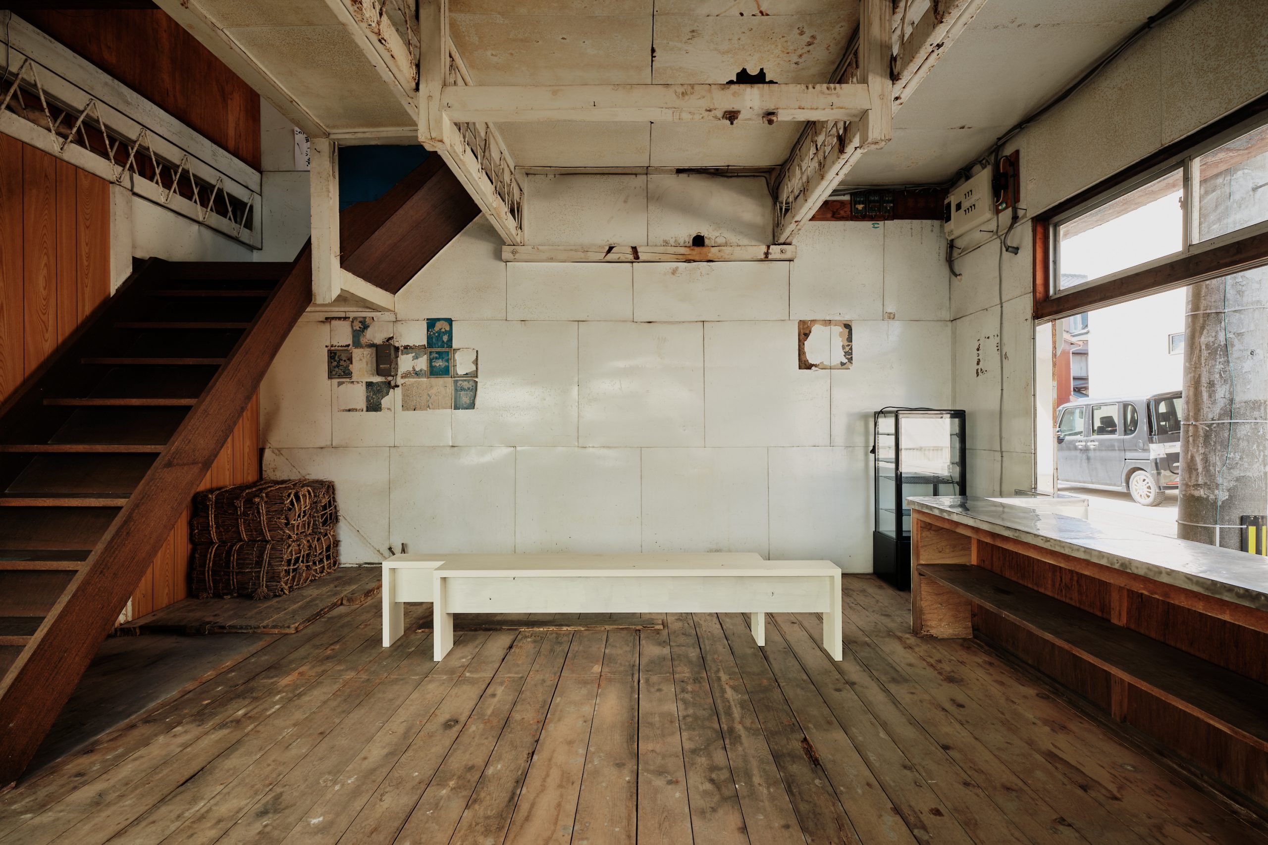 The second facility, Kado House, stands out the rusted tin cladding of its exterior, is a former residence that once also housed a noodle workshop. The earthen-floored space in the foreground on the first floor is once for production and sales. When you open the fittings wide, it turns into a semi-outdoor space that opens to street. Available as a venue for hosting markets or small-scale events.